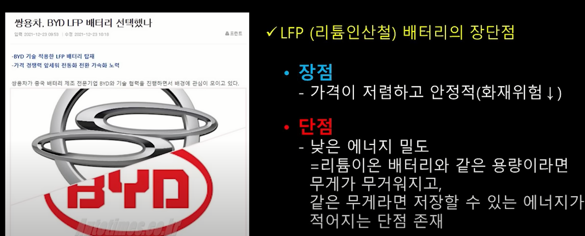 차량 무게와도 관계를 갖고 있죠 리튬 이온 배터리와 같은 용량의 리튬 인산철 배터리라면 무게가 더 무거워지고요 같은 무게를 가졌다면 저장할 수 있는 에너지가 적어지기 때문에 더 멀리 못 가는 현상이 발생하는 것입니다.