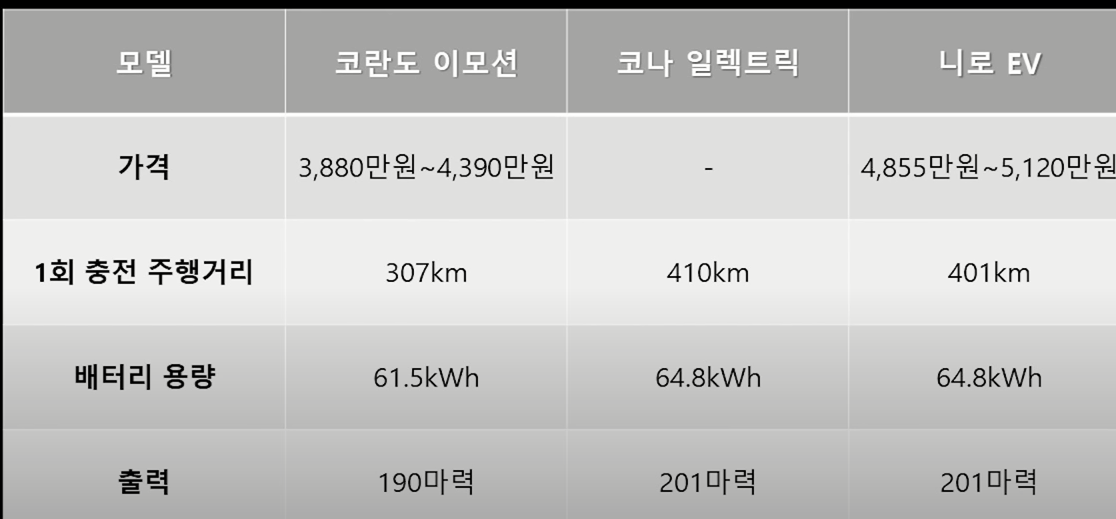 코란도 이모션은 사실상 성공한 전기차는 아닙니다 전기차에서 가장 중요하게 생각하는 주행거리가 경쟁 모델 대비 짧았고 디자인적으로도 뭐 그렇게 매력적이진 않았으니까요.. 현재 신형 코나 일렉트릭의 가격이 아직 공개되지 않았지만 스펙은 공기가 되었는데요 1회 충전으로 410km 주행이 가능하고 64 38kw씩 배터리에 201마력을 댑니다.