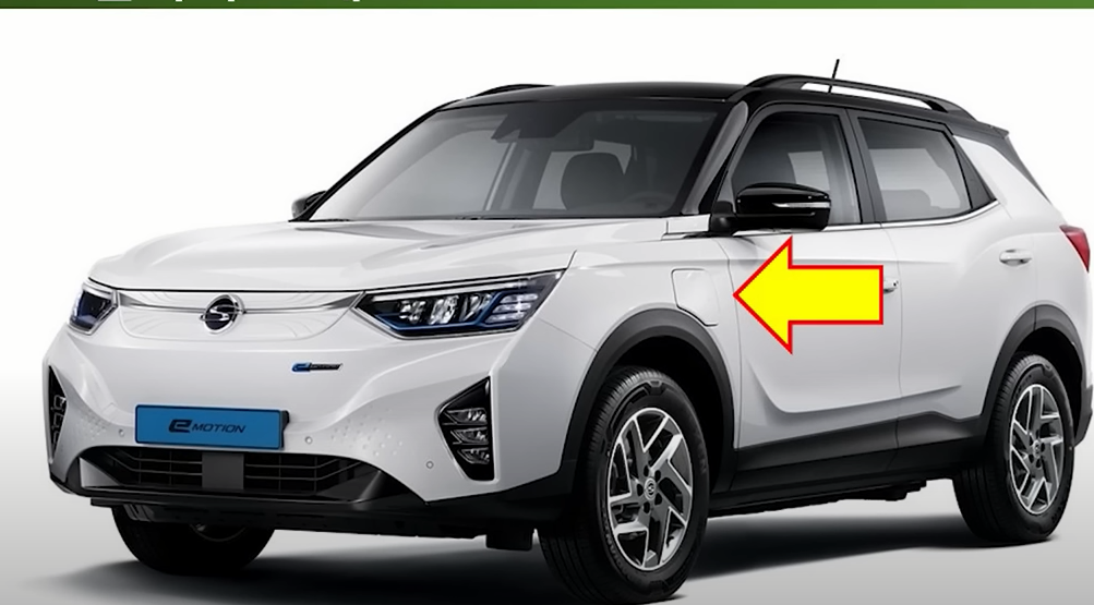 그리고 토레스 evx의 충전구는 운전석 앞 위에 마련되어 있어요 현대 코나와 기아 니로는 앞쪽에 위치해 있는 것과는 달리 토레스 evx는 옆쪽에 있기 때문에 후진 주차했을 때 좀 더 충전하기가 수월하지 않을까 싶은데요 코란도 이모션의 충전구 위치와 동일한 곳에 있습니다.