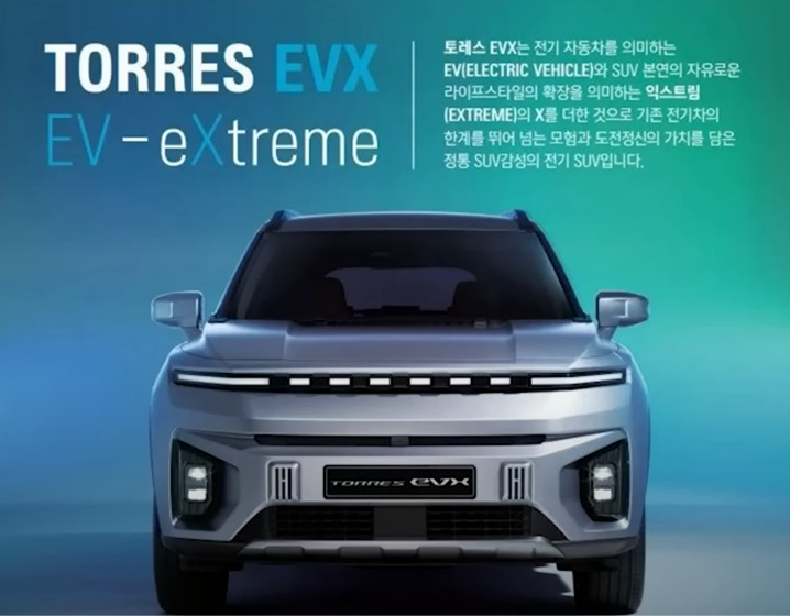 토레스 evx는 3월 30일 실물 공개 전 먼저 티저 영상을 공개했습니다 단 15초 밖에 안 되는 정말 짧은 영상이지만 대중들의 토레스 evx에 대한 반응은 정말 뜨거웠는데요..일단 단번에 시선을 사로잡는 건 토레스 evx 너무나도 멋진 디자인입니다 내연기관 모델인 토레스를 전기차 버전으로 바꾼 건데요 아주 전기차스러우면서도 토레스의 느낌을 가져가고 있어 현재 아주 호평을 받고 있는 디자인입니다.
